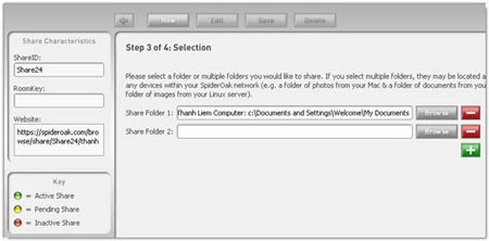 Mặc dù tất cả dữ liệu lưu trữ được mã hóa, bạn vẫn có thể chọn chia sẻ một phần mạng SpiderOak (hoặc công khai) với gia đình, bạn bè, đồng nghiệp hoặc khách hàng. Bạn có thể tạo ShareRoom bằng cách chọn bất kỳ thư mục nào từ nhiều máy tính.