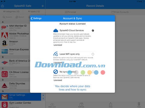 - Đồng bộ: Dữ liệu cá nhân của bạn sẽ được đồng bộ tự động thông qua dịch vụ đám mây SplashID hoặc thông qua mạng WiFi cục bộ.