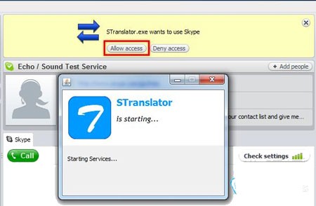 Một thông báo sẽ xuất hiện trên giao diện Skype với nội dung STranslator.exe wants to use Skype. Hãy xác nhận bằng cách nhấn vào Allow access để cấp quyền truy cập cho STranslator.