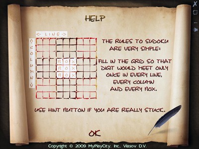 Sudoku là một trò chơi giải đố (puzzle) nổi tiếng của Nhật Bản, với giao diện mang đậm tính nghệ thuật cổ xưa. Người chơi cần điền các số từ 1-9 vào ô 9x9 sao cho mỗi hàng, mỗi cột và mỗi ô 3x3 không lặp lại số nào.