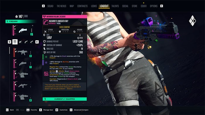 Cách xây dựng Harley Quinn này phát huy tối đa hiệu quả khi sử dụng vũ khí tầm gần và tầm trung, đặc biệt là súng lục và SMG. Một lựa chọn tuyệt vời là Bizarro’s Undeath Ray, một khẩu súng lục mạnh mẽ.