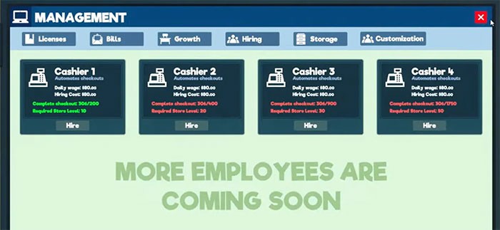 Trong quá trình xây dựng và phát triển cửa hàng tạp hóa cá nhân, người chơi có thể thuê nhân viên thu ngân trong Supermarket Simulator nhằm hỗ trợ quá trình thanh toán cho khách hàng.