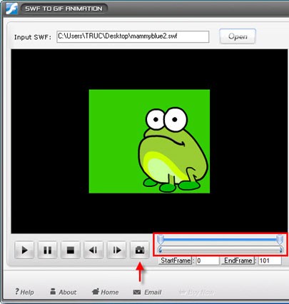 Chương trình còn cho phép bạn chụp lại một khung hình cụ thể trong file Flash bằng cách kéo thanh trượt đến khung mong muốn và nhấn biểu tượng camera. Ảnh chụp có thể được lưu dưới nhiều định dạng khác nhau như JPG, GIF, BMP, PDF, PSD,…