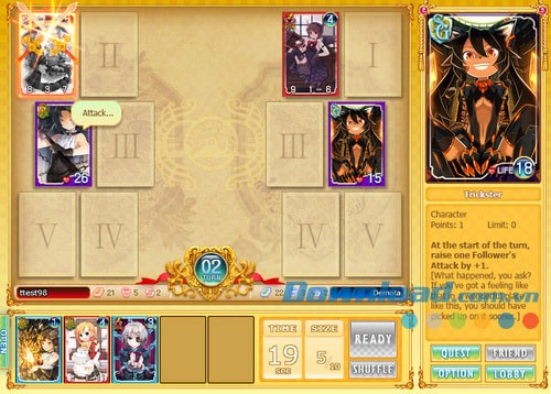 - Trong trường hợp đối thủ không còn lá bài nào trên bàn, người chơi sẽ trừ trực tiếp vào lượng máu của lá bài Character của đối phương, dựa trên kích thước của các lá bài mà người chơi đang sở hữu.