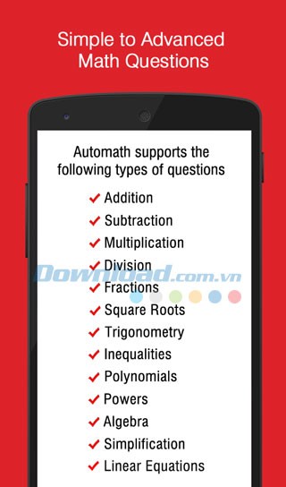 - AutoMath hỗ trợ: cộng, trừ, nhân, chia, bất đẳng thức, phương trình tuyến tính, đa thức, đại số, số mũ, lượng giác, vv.