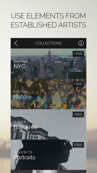 Đầu tiên, bạn cần nhập ảnh nền và ảnh phủ (foreground). Người dùng có thể lựa chọn ảnh từ thư viện Camera Roll trên thiết bị của mình. Ngoài ra, Fused còn cung cấp các gói Artists Collection đa dạng, sẵn sàng để bạn sử dụng.