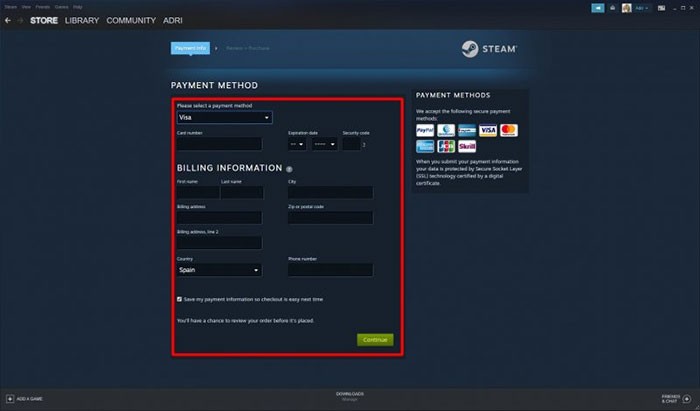 Bước 4: Trên giao diện kế tiếp, hãy chọn phương thức thanh toán phù hợp, điền đầy đủ thông tin cần thiết và nhấn vào nút Continue để xác nhận.