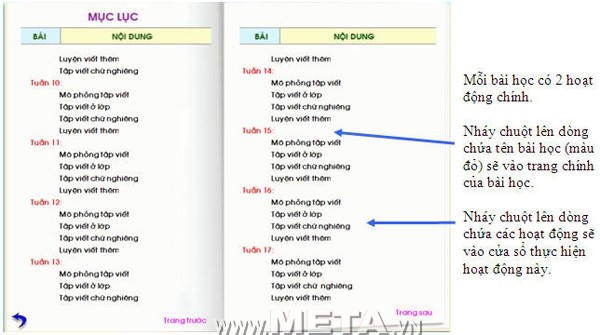 Sử dụng phím PgUp hoặc PgDn để chuyển đến các trang khác nhau của Mục lục. Hoặc nhấp chuột vào các vị trí có dòng chữ Trang sau, Trang trước.