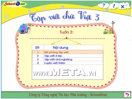 Luyện tập viết:Hoạt động này mô phỏng các bài luyện tập viết theo sách Tập Viết 3 do NXBGD phát hành. Trong chương trình môn học Tiếng Việt, học sinh và giáo viên sẽ cùng nhau luyện tập viết theo đúng bộ sách này.