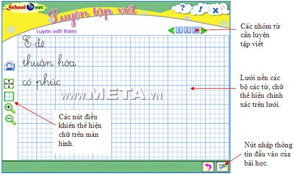 Trên màn hình, người dùng nhìn thấy một lưới kẻ ngang hoặc vuông giống cách thể hiện trong sách Tập Viết 3. Mỗi bài học có thể bao gồm nhiều nhóm từ cần luyện tập viết. Nhấp vào các nút có ghi số 1, 2,... ở phía trên cửa sổ này để vào các bài luyện khác.