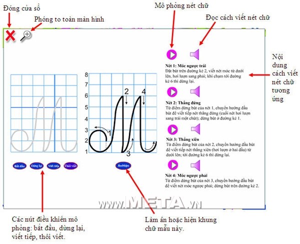 Khung bên phải màn hình sẽ hiển thị hướng dẫn cụ thể cách viết chữ (số) hiện tại theo từng nét bút.