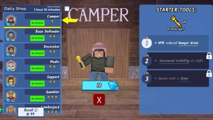 - Camper: Yêu cầu 10 Gem, khởi đầu với 1 Flashlight.