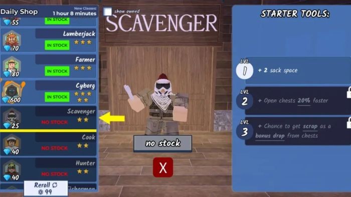 - Scavenger: Cần 25 Gem, không có vật phẩm khởi đầu.