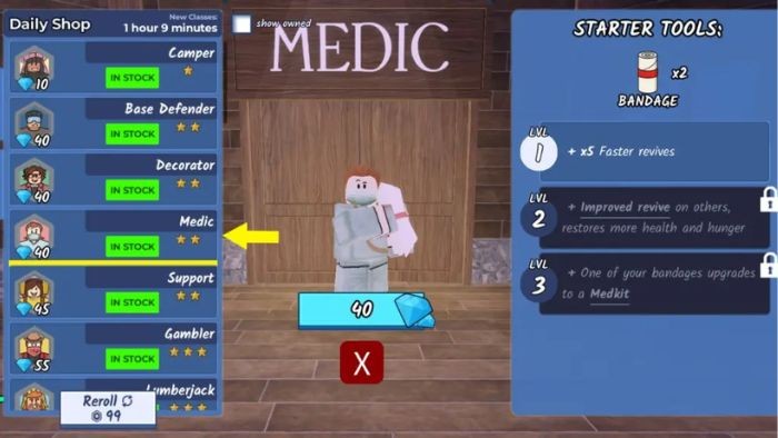 - Medic: Yêu cầu 40 Gem, trang bị khởi đầu là 2 Bandage.