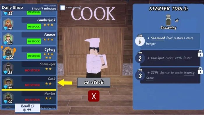 - Cook: Cần 40 Gem, khởi đầu với 1 Seasoning.