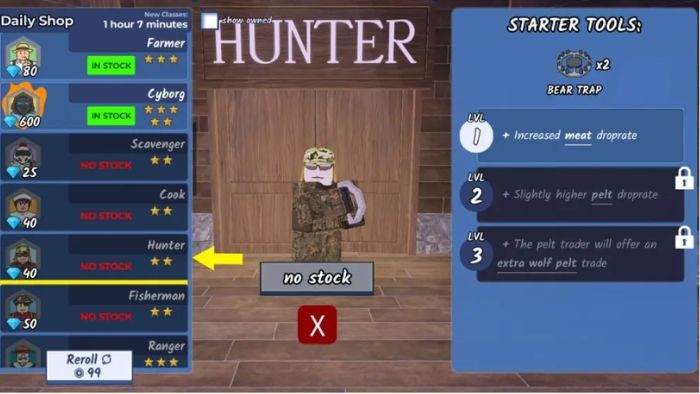 - Hunter: Đòi hỏi 40 Gem, bắt đầu với 2 Bear Trap.