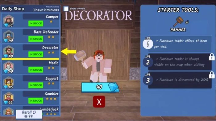 - Decorator: Yêu cầu 40 Gem, trang bị khởi đầu là 1 Hammer.