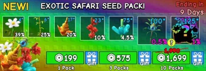 Một lựa chọn khác là mua gói bằng Robux, và phần thưởng nhận được cũng rất đáng giá. Bằng cách sử dụng Robux, người chơi có thể sở hữu Exotic Safari Seed Pack – phiên bản nâng cao hơn so với gói thông thường.