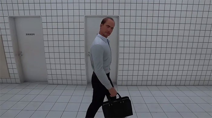 Vì người đàn ông bước xuống là nhân vật chính của mọi phân cảnh nên rất dễ bỏ qua chi tiết này. Anh ta hành động như thường lệ, nhưng sẽ nở một nụ cười toe toét trên khuôn mặt.