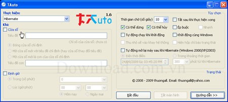 Ngoài ra, TAuto còn có khả năng thiết lập thời gian khởi động lại máy sau khi hệ thống chuyển sang chế độ Hibernate. Phần mềm này có thể tự động thực hiện các tác vụ như Hibernate, Shut Down, Restart, Log Off, Stand By và Lock máy tính dựa trên các điều kiện được thiết lập: