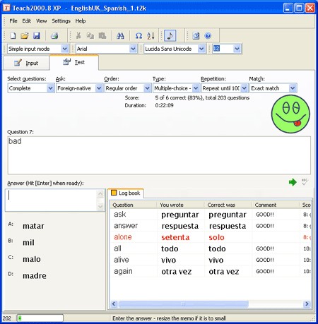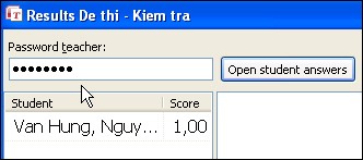 Sau khi học viên hoàn thành, bạn mở công cụ Teach2000, vào mục File > Check test results (teacher), nhập mật khẩu và nhấn Open student answers để xem kết quả. Chương trình sẽ thống kê điểm số, câu trả lời sai của từng học viên.