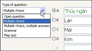 Với dạng Multiple choice, bạn nhập câu hỏi vào khung Question, sau đó điền các câu trả lời vào các mục A, B, C, D,… và chọn đáp án đúng rồi nhấn