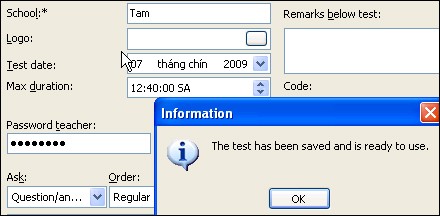 Lưu ý: Điền tên bài kiểm tra vào mục Title of the test:, chủ đề vào mục Topic:, tên giáo viên vào mục Teacher:, tên trường vào mục School:. Nhập mật khẩu bảo vệ file đề thi vào mục Password teacher và mã số học viên/sinh viên/học sinh vào mục Password student. Chọn nơi lưu file đề thi trong mục Shared network location.