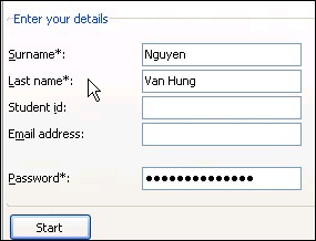 Học viên mở file đề thi, nhập đầy đủ thông tin và mật mã, sau đó nhấn Start để bắt đầu làm bài. Điểm đặc biệt của Teach2000 là học viên không thể tắt ngang bài thi và nộp bài trắng.