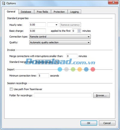 Để tùy chỉnh các thiết lập tổng quát, bạn hãy chọn Extras > Options từ thanh menu chính. Tại giao diện này, việc xác định giá theo giờ, phí cố định và phương pháp kết nối được thực hiện một cách dễ dàng, cùng với khả năng chủ động thêm mới các loại tiền tệ khác nhau.