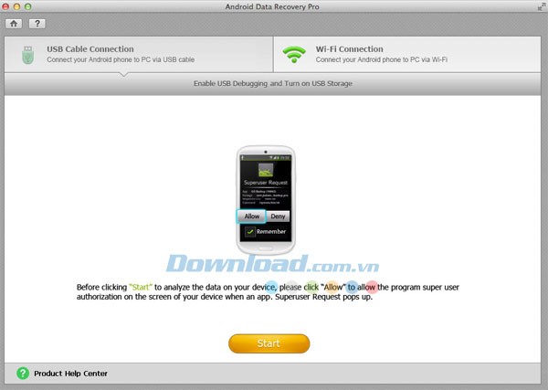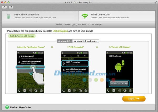 Phương pháp đầu tiên để liên kết thiết bị Android với máy tính là sử dụng cáp USB. Hãy thực hiện theo các bước sau. Lưu ý, trong suốt quá trình quét, không được ngắt kết nối thiết bị, nếu không quá trình quét có thể bị gián đoạn và thất bại.