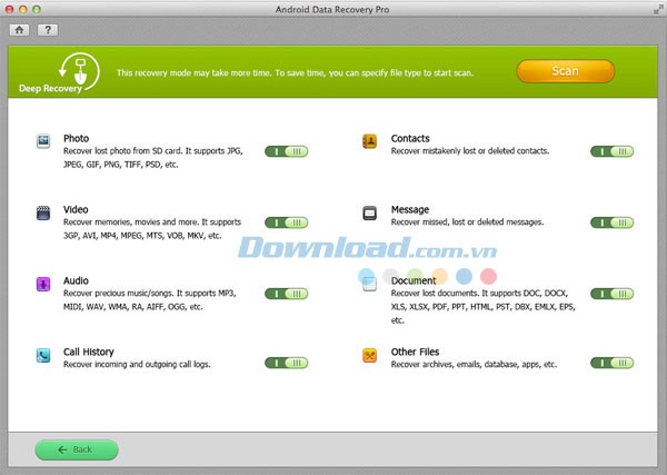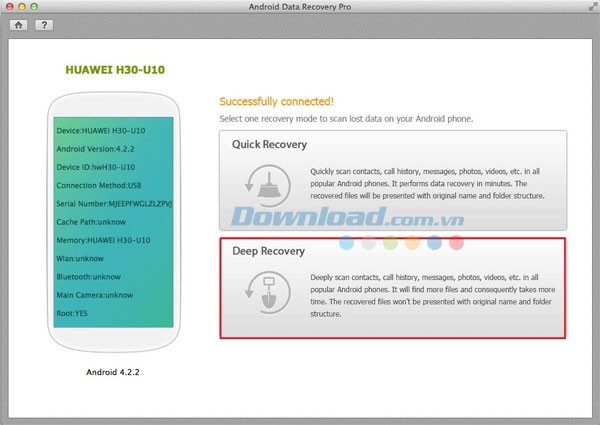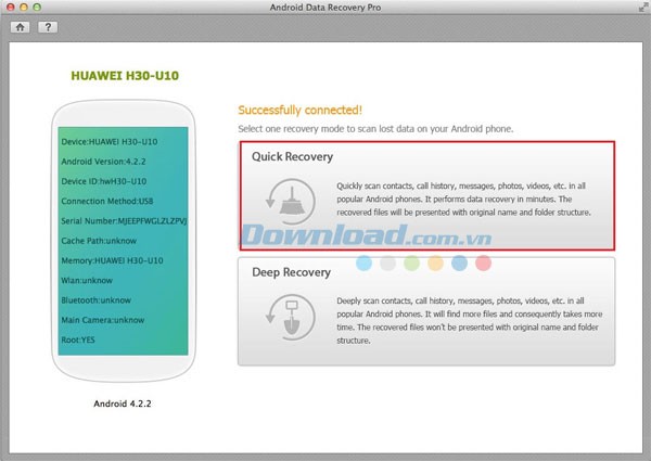 Sau khi kết nối thành công thiết bị Android với máy Mac, bạn có thể tiến hành quét thiết bị. Chương trình cung cấp hai chế độ phục hồi: Quick Recovery và Deep Recovery.