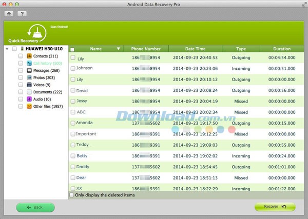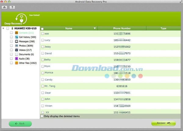 - Phục hồi danh bạ Android, bao gồm cả số điện thoại và tên liên hệ.