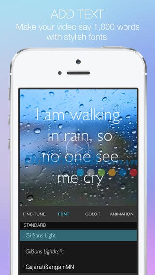 Ứng dụng cung cấp nhiều tùy chọn phông chữ, chú thích bắt mắt, khả năng chèn trích dẫn hoặc cụm từ tùy ý vào video. Bạn cũng có thể lựa chọn từ bộ sưu tập màu sắc đa dạng, thêm nhạc nền cho video và áp dụng nhiều hiệu ứng hình ảnh đặc sắc.