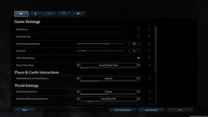 Giao diện này cung cấp khả năng điều chỉnh kích thước hiển thị và các cài đặt tổng quát của trò chơi. Trong trường hợp bạn dự định trải nghiệm một mình, không có ý định cho người khác tham gia, hãy chọn ô Only Solo Play. Các tùy chọn liên quan đến số lượng người chơi đồng thời, quy mô bang hội, chức năng trò chuyện và khả năng cướp bóc người chơi đã gục ngã không ảnh hưởng đến chế độ chơi đơn, do đó việc điều chỉnh chúng là không cần thiết.