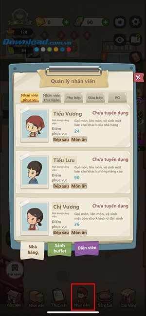 Trong giai đoạn hướng dẫn, người chơi sẽ tuyển dụng một nhân viên phục vụ bàn. Mỗi loại nhân viên sẽ chịu trách nhiệm quản lý các khu vực riêng biệt trong nhà hàng.