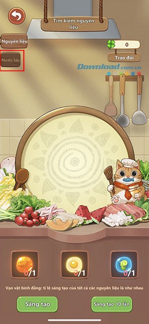 Bên cạnh việc sử dụng nguyên liệu, người chơi còn có thể tạo ra nhiều loại nước dùng mới, đặc biệt dành cho món lẩu. Để bắt đầu sáng tạo nước lẩu, hãy chạm vào Sáng tạo > Nước lẩu.