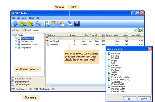 Tiff Teller là một ứng dụng chuyên dụng, có khả năng xác định chính xác số lượng trang trong các tập tin PDF và TIFF. Phần mềm này đồng thời cung cấp các thông tin chi tiết liên quan đến từng file TIFF và PDF được xử lý.