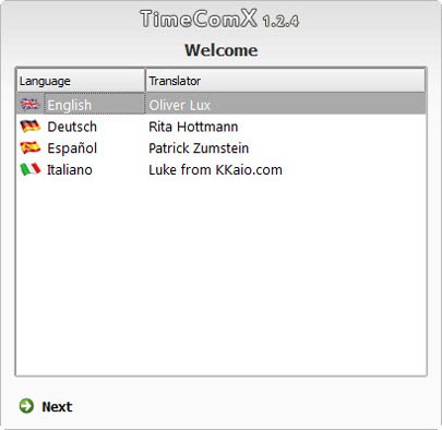 Sau khi tải và cài đặt thành công, bạn khởi chạy biểu tượng TimeComX trên màn hình. Một cửa sổ sẽ xuất hiện, yêu cầu bạn chọn ngôn ngữ sử dụng. Thông thường, bạn nên chọn English và nhấn Next.