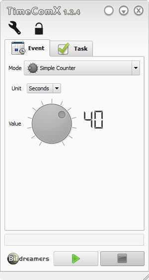 Giao diện của TimeComX được chia thành hai thẻ chính: Event và Task. Thẻ Event cung cấp nhiều tùy chọn để thực hiện tác vụ thông qua thẻ Task. Tại thẻ Event, bạn chọn phương thức thực hiện tác vụ trong mục Mode, sau đó thiết lập các thông số như sau: