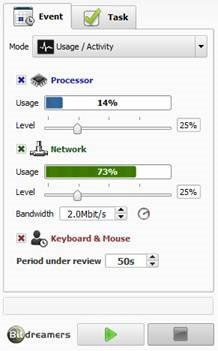 Usage/Activity: Thực hiện tác vụ khi mức sử dụng bộ nhớ và các tác vụ hoạt động vượt quá giới hạn được thiết lập. Processes: Thực hiện tác vụ khi các ứng dụng đang chạy gặp sự cố sau một khoảng thời gian nhất định. Tại đây, ứng dụng sẽ tự động kiểm tra và thực hiện tác vụ với 3 nhóm: Processes (bộ xử lí của máy tính), Network (đường truyền mạng), Keyboard & Mouse (bàn phím và chuột). Bạn kéo thanh trượt tại mục Level để xác định ngưỡng sử dụng tài nguyên hệ thống. Với tùy chọn Keyboard & Mouse, bạn nhập thời gian đếm lùi vào ô Period under review khi chuột và bàn phím không hoạt động.