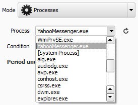 Processes: Thực hiện tác vụ khi một ứng dụng đang mở bị treo. Tùy chọn này áp dụng cho tất cả các ứng dụng đang chạy. Bạn nhấn vào nút mũi tên tại trường Process để chọn ứng dụng cần thiết lập. Sau đó, chọn trạng thái của tác vụ là đang chạy (Run) hoặc không chạy (Not Run) tại mục Condition. Cuối cùng, nhập thời gian đếm lùi vào ô Period under review.