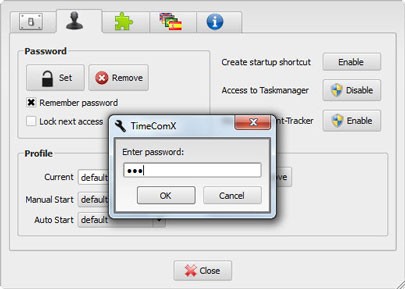 Cài đặt mật khẩu sử dụng: Để hạn chế việc sử dụng chương trình từ những người không mong muốn, bạn nên thiết lập mật khẩu. Đầu tiên, bạn nhấn vào nút Options ở góc trên bên trái giao diện chính và chọn thẻ có biểu tượng khóa. Sau đó, nhấn Set tại mục Password, nhập mật mã vào ô Enter password và nhấn OK để xác nhận.