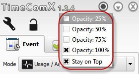Giao diện trong suốt: TimeComX cho phép bạn làm trong suốt giao diện của chương trình so với màn hình với 4 mức độ: 25%, 50%, 75% và 100%. Để chọn độ trong suốt, bạn nhấn chuột phải lên thanh tiêu đề của TimeComX và chọn mức độ ưa thích.