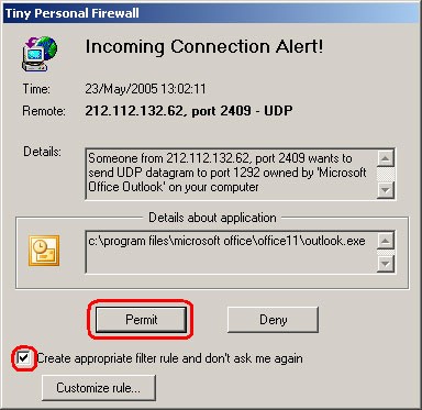 Tiny Personal Firewall sẽ hướng dẫn giúp bạn quyết định khi nào thì từ chối hay chấp nhận dữ liệu trong từng tình huống, từ đó bạn xác định được luật lệ cho các công việc tương tự trong tương lai.