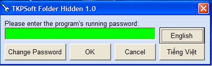 Sau khi tải xuống và giải nén, bạn chỉ cần nhấp vào file TKPSoft Folder Hidden.exe để khởi chạy chương trình mà không cần cài đặt. Lần đầu tiên sử dụng, chương trình sẽ thông báo mật khẩu mặc định là "pasword". Bạn có thể thay đổi mật khẩu này bằng cách nhấn vào nút Change Password.