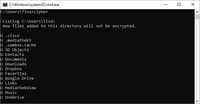 Sử dụng cipher /e:<tên tệp> để mã hóa tập tin, cipher /c:<tên tệp> để truy xuất thông tin về các tập tin đã mã hóa và cipher /d:<tên tệp> để giải mã tập tin đã chọn. Tuy nhiên, người dùng có thể đơn giản hóa quy trình này bằng công cụ mã hóa Windows BitLocker.