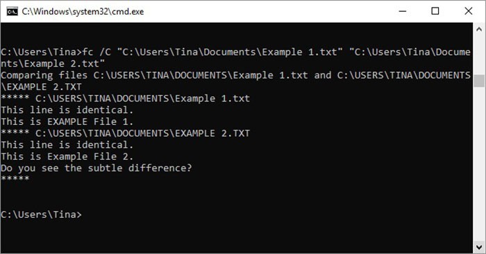 Lệnh này cho phép người dùng xác định sự khác biệt về nội dung giữa hai tập tin. Nó đặc biệt hữu ích cho các lập trình viên đang tìm kiếm những thay đổi nhỏ giữa hai phiên bản của một tập tin. Chỉ cần nhập fc, sau đó nhập đường dẫn thư mục và tên của hai tập tin cần so sánh.