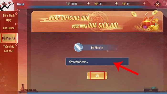 Bước 2: Chọn tab Đổi Phúc lợi. Sau đó, hãy nhập chính xác mã code đã được cung cấp, hoặc sao chép và dán vào ô nhập liệu. Nhấn nút Đổi để hoàn tất quá trình và nhận thưởng.