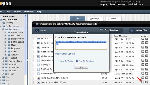 Sau khi quá trình chia sẻ hoàn tất, Tonido sẽ thông báo thành công và cung cấp đường dẫn (link) để truy cập file hoặc thư mục.