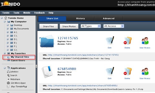 Thay vì upload từng file riêng lẻ, Tonido cho phép bạn chia sẻ cả thư mục (folder) một cách nhanh chóng. Thao tác thực hiện tương tự như chia sẻ file đơn lẻ.